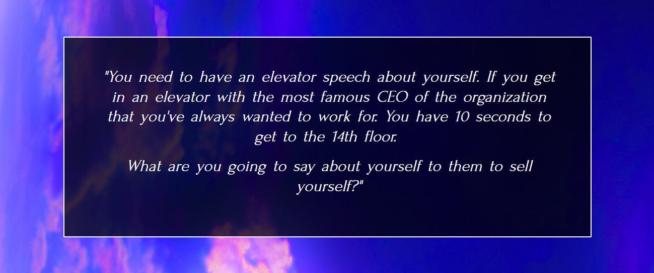 “You need to have an elevator speech about yourself. If you get in an elevator with the most famous CEO of the organization that you’ve always wanted to work for.